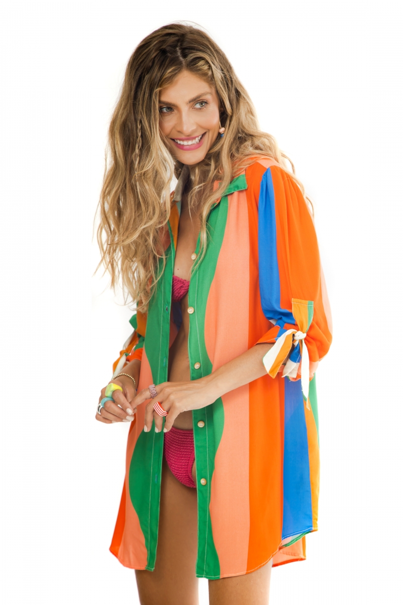 Chemisier desenvolvida em tecido viscose, modelagem ampla, punho com amarração e botões frontais.