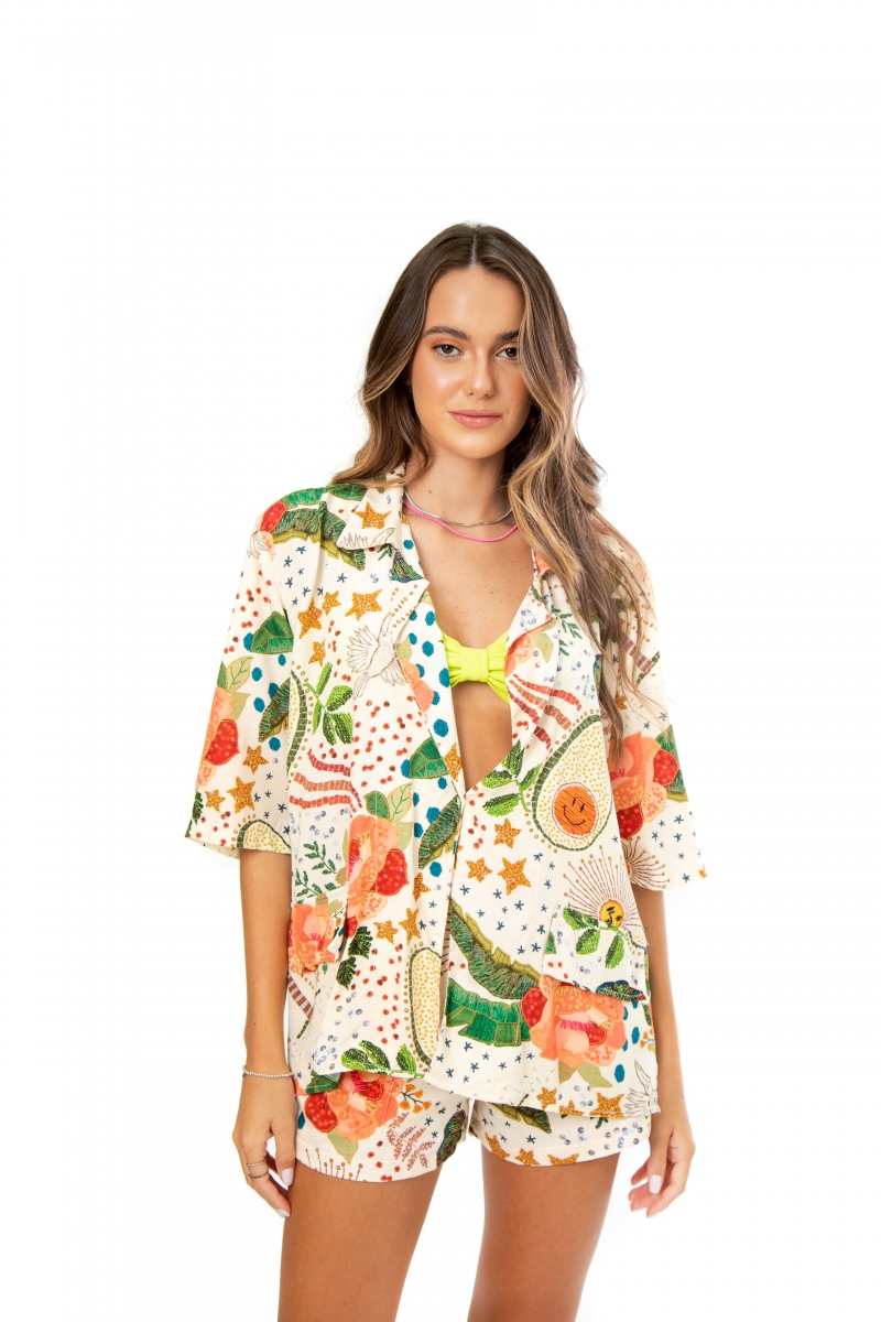 Kimono blazer desenvolvido em tecido viscose, modelagem ampla, gola, fecho opcional frontal por botão.