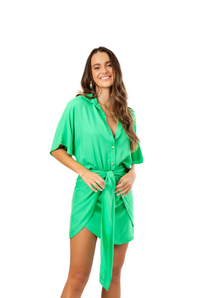 Vestido desenvolvido em tecido viscose, botões frontais, gola e amarração frontal.