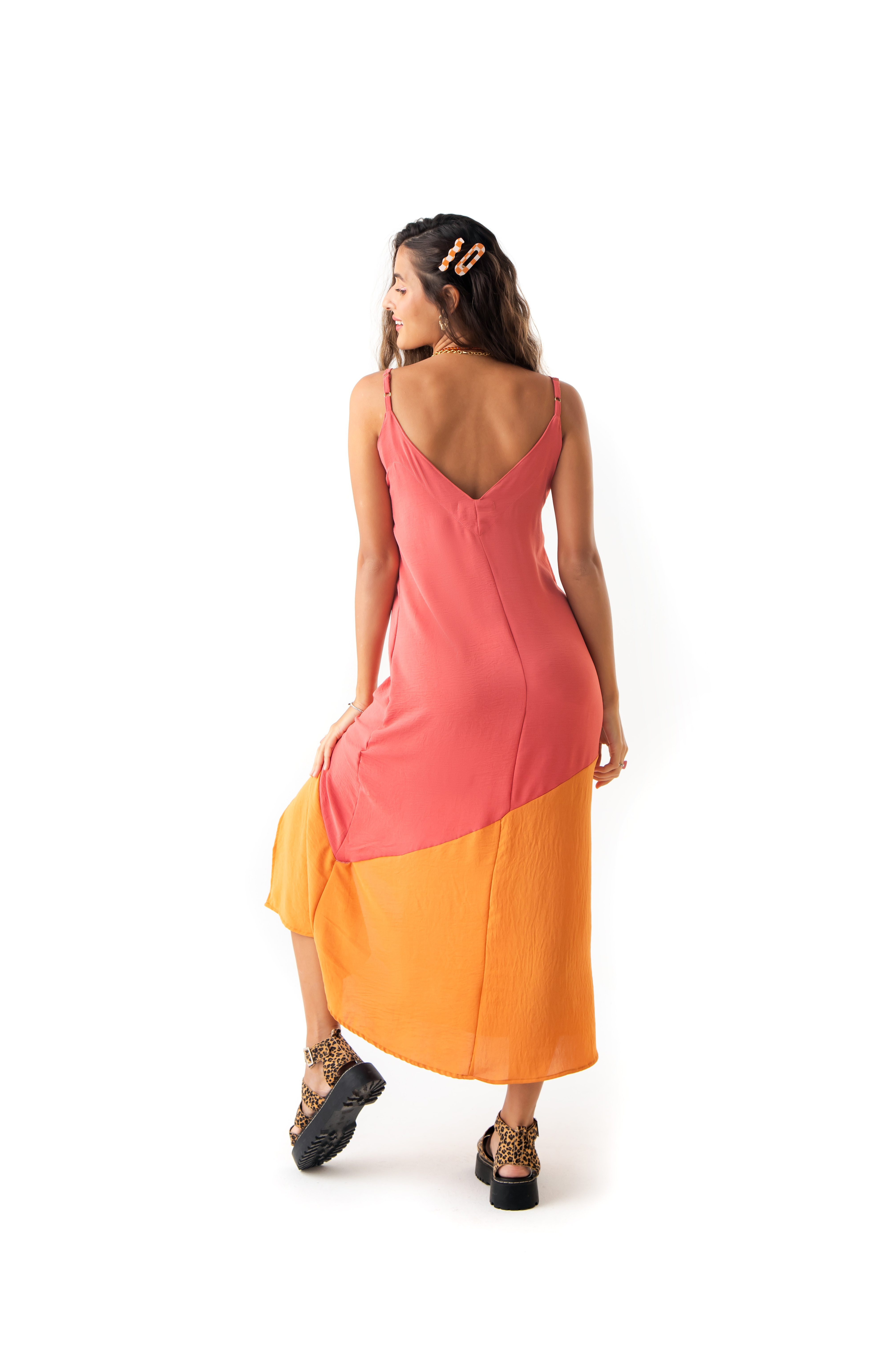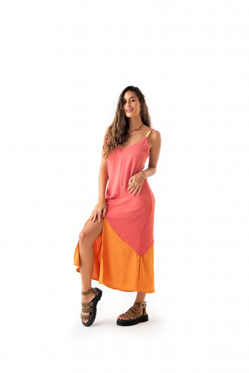 Vestido desenvolvido em tecido fluido, toque macio, alças reguláveis com detalhe em miçangas e fenda frontal.