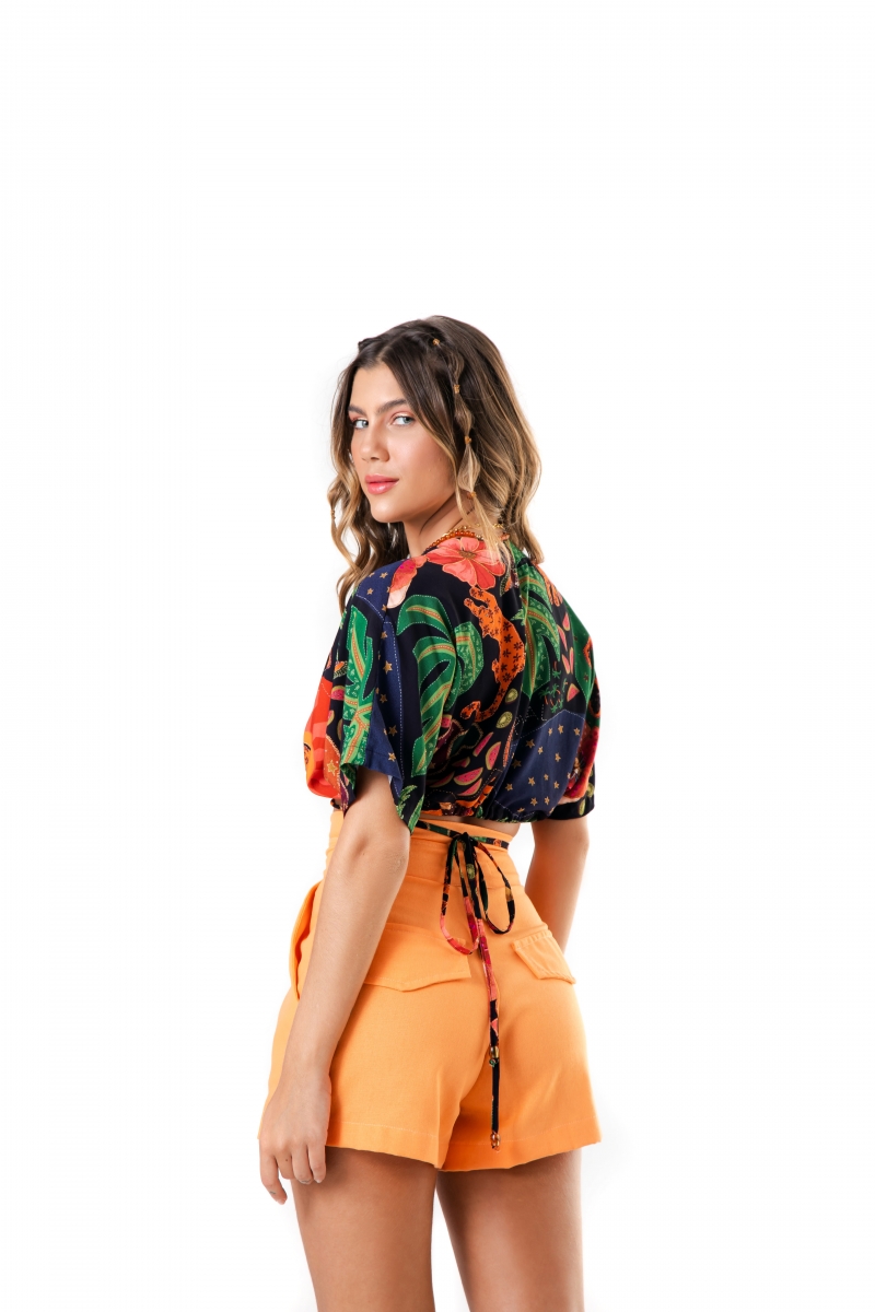 Cropped desenvolvida em tecido viscose, amarração frontal e estampa floral.