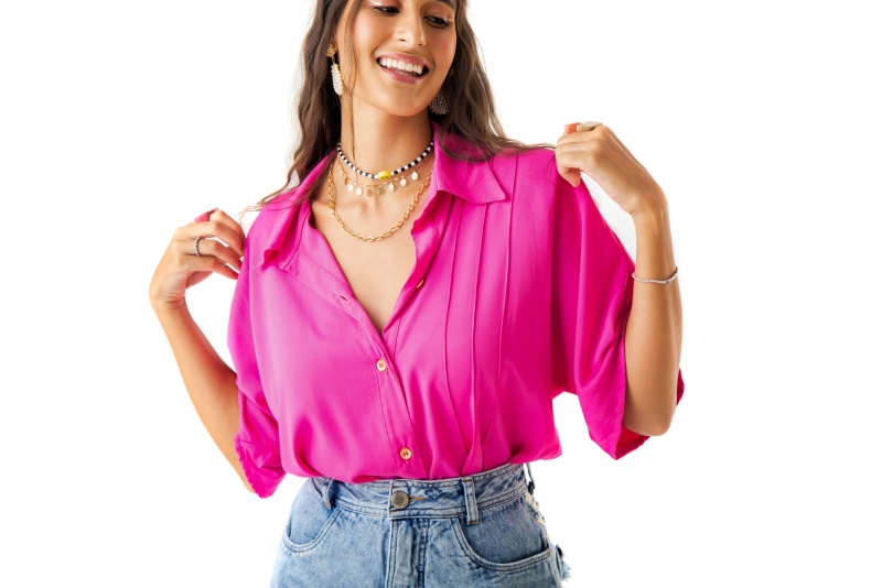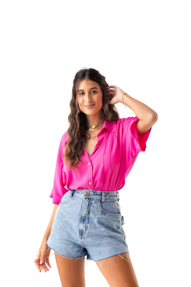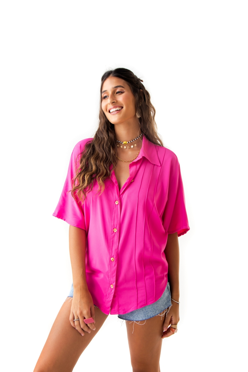 Camisa desenvolvida em tecido viscose, mangas amplas, nervuras frontais e fecho por botões.