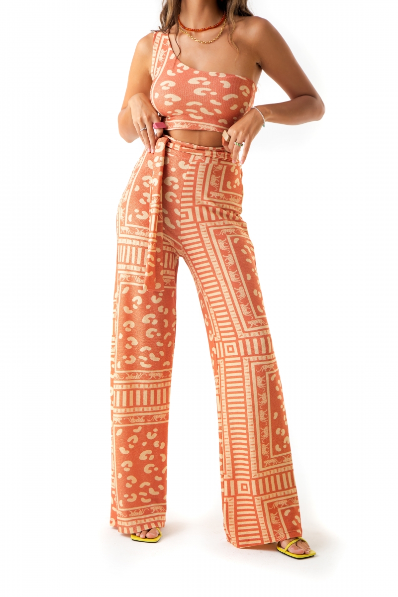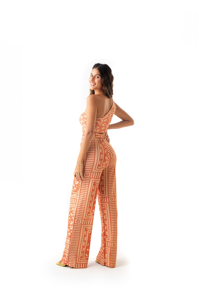 Calça desenvolvida em tecido lurex com elastano, modelagem cintura alta e pantalona, tem amarração no cós e estampa de onça.