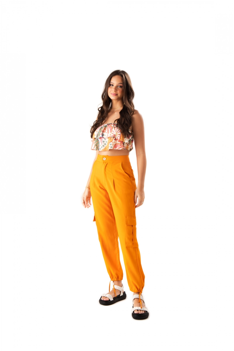 Cropped desenvolvida em tecido viscose, alças reguláveis, babados com elástico embutido e estampa tropical.