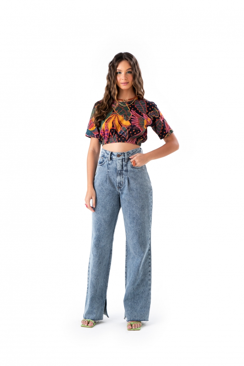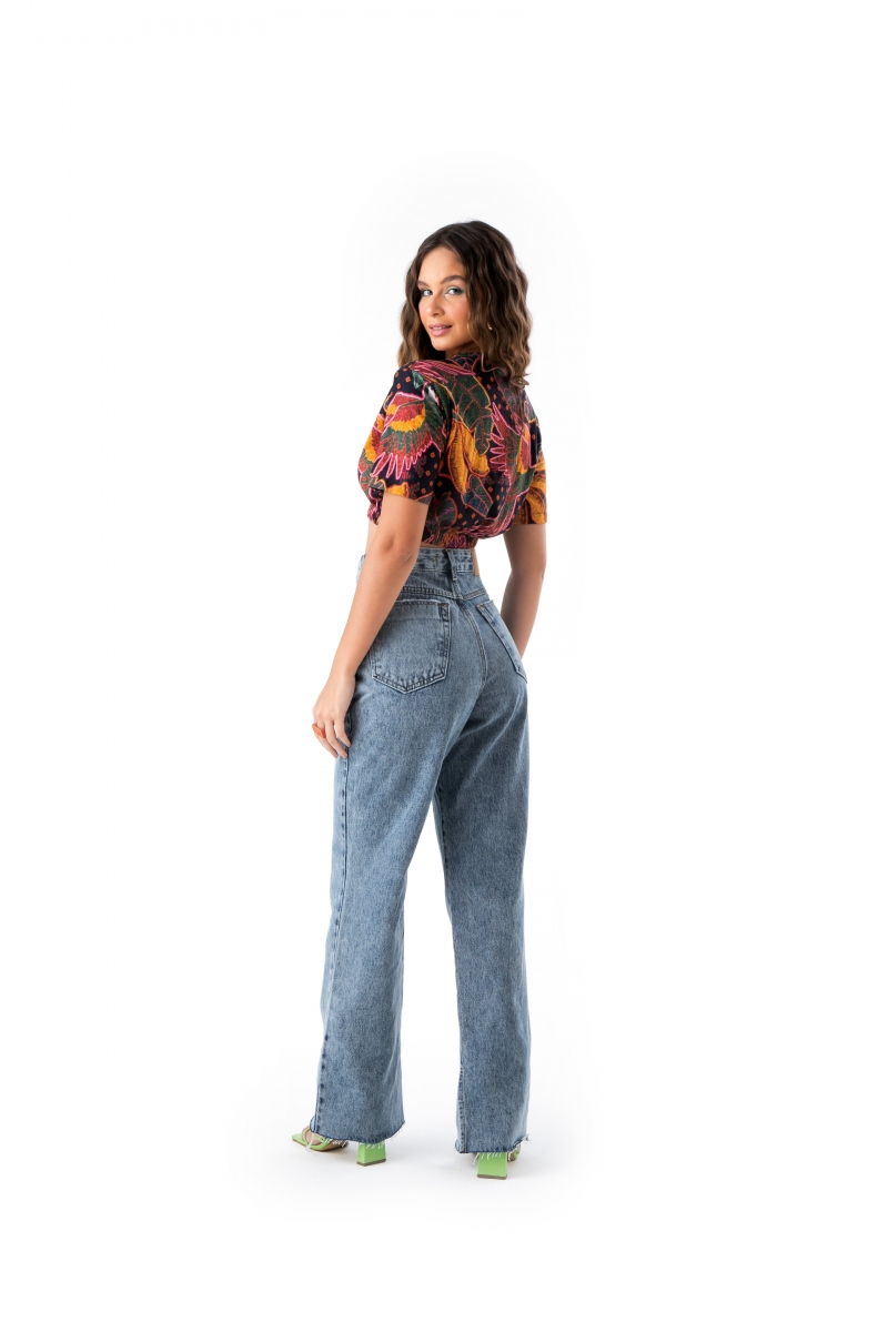 Calça desenvolvida em jeans 100% algodão, pregas frontais, bolsos laterais e traseiros.
