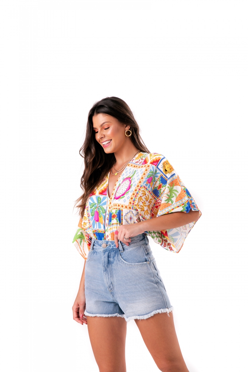 Body desenvolvido em tecido viscose, parte inferior da calcinha em malha viscolycra, decote V e mangas fluidas e amplas.