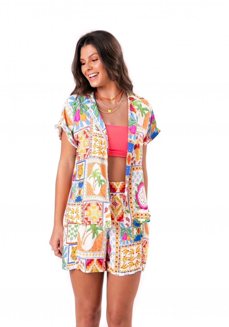 Camisa desenvolvida em tecido viscose, estamparia digital, com gola, tapeta e botões frontais.