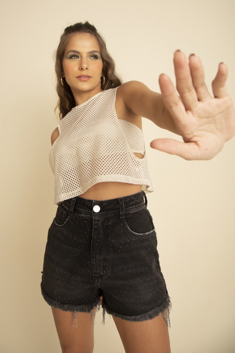 Regata desenvolvida em tecido poliamida com leve brilho, gramatura leve e medida do busto referente ao top.