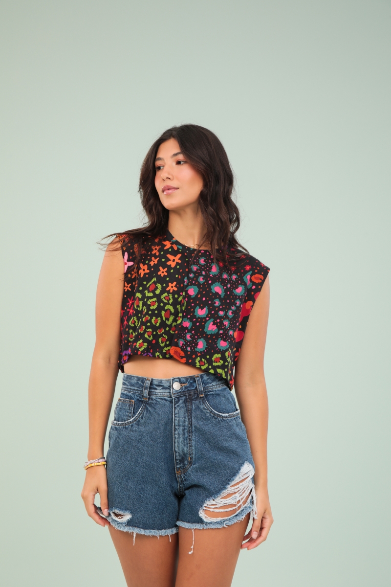 Regata estampa onça preta, desenvolvida em malha 100% algodão e modelagem ampla.