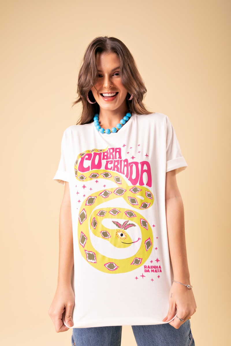 T-shirt desenvolvida em tecido 100% algodão de toque macio, aplicação frontal de silk e modelagem ampla.