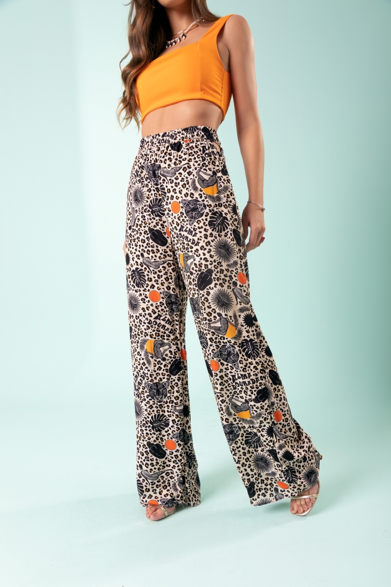 Calça desenvolvida em viscose, elástico e vazado na cintura.