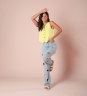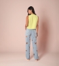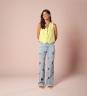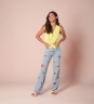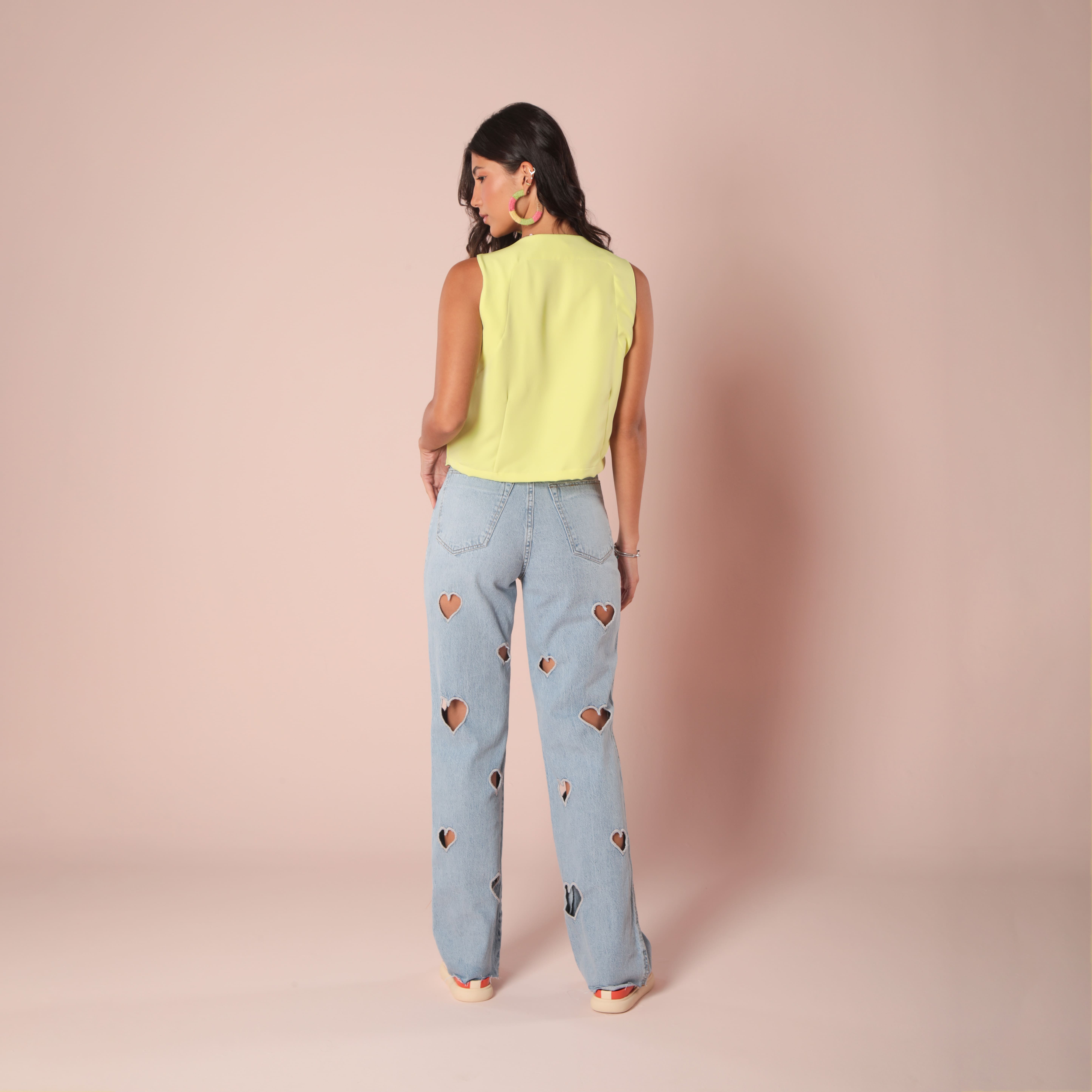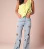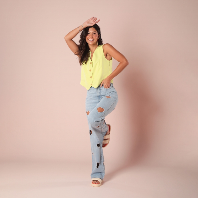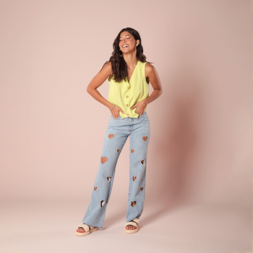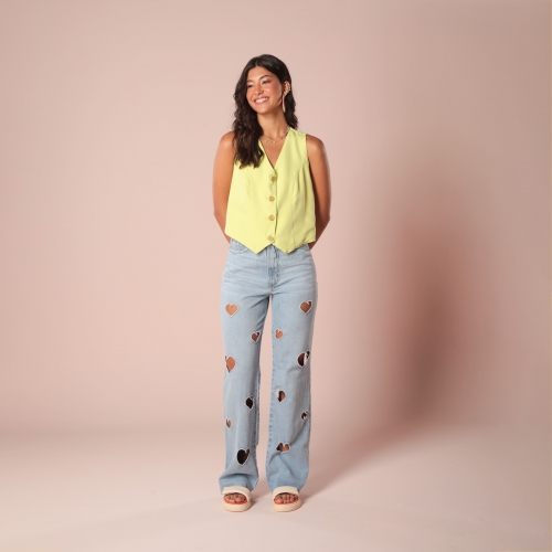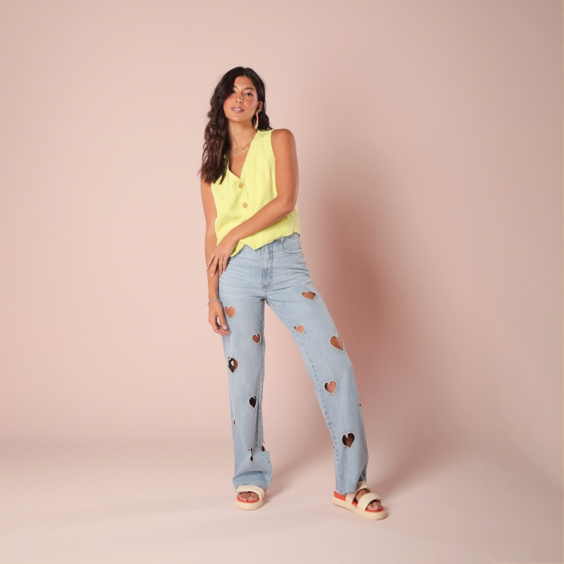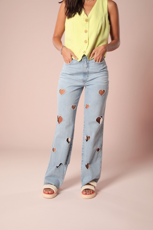 Calça desenvolvida em tecido jeans de gramatura média, modelagem cintura alta, bordados de coração vazados e lavagem clarinha.