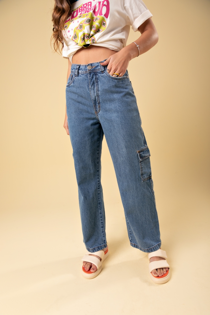 Calça desenvolvida em tecido jeans 100% algodão, modelagem reta com bolsos cargos nas laterais e lavagem intermediária.