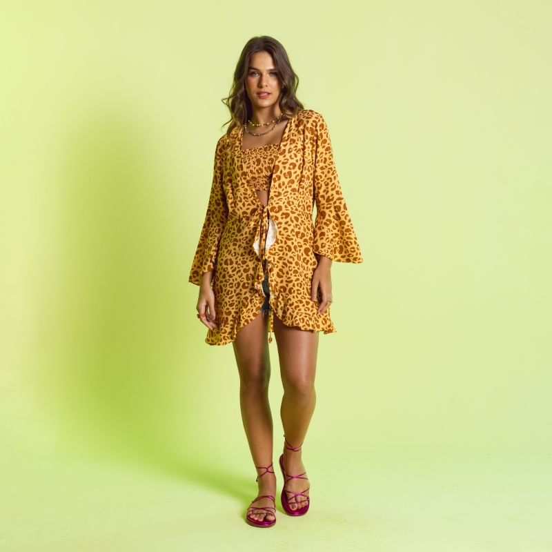 Kimono desenvolvido em tecido viscose, mangas e barras com babados, amarração frontal opcional, acompanha top de lastex.