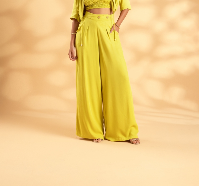 Calça desenvolvida em tecido viscose, modelagem pantalona, bolsos laterais e pences frontais.