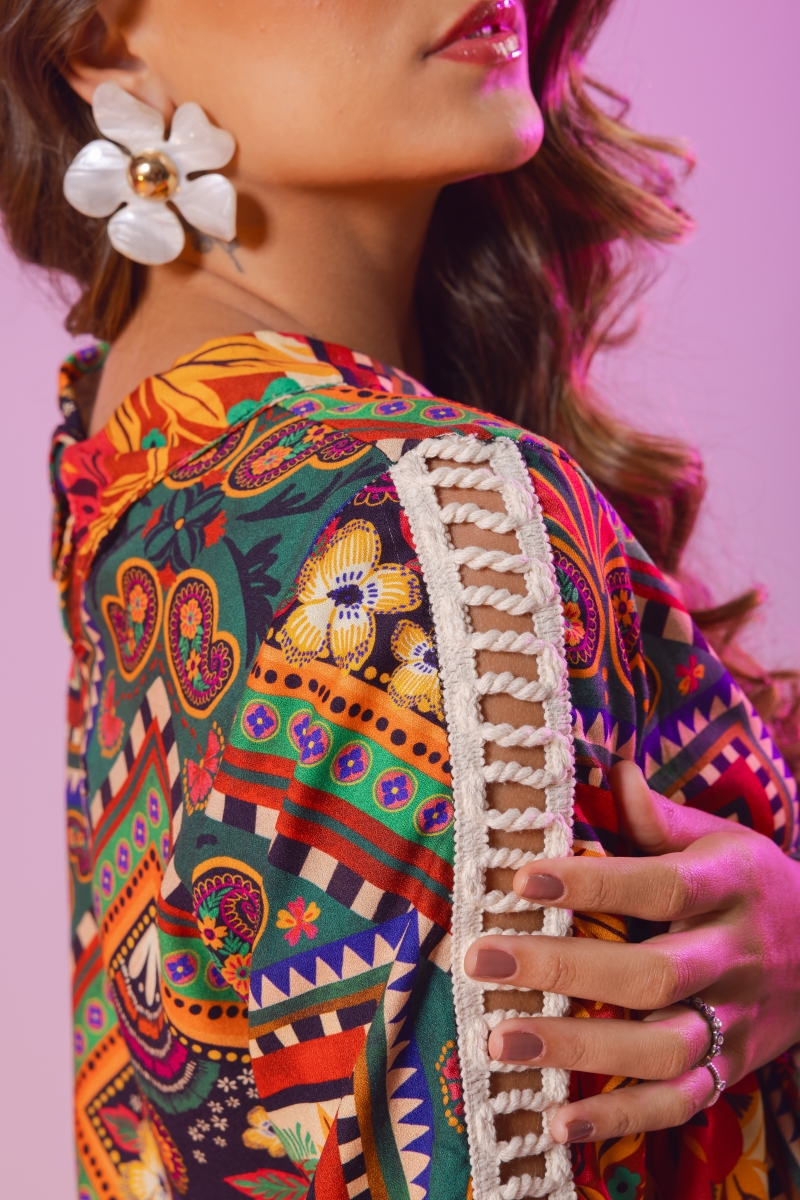 Camisa cropped assimétrica, com aplicação de aviamento vazado, frontal e mangas, e estampa exclusiva Fille.