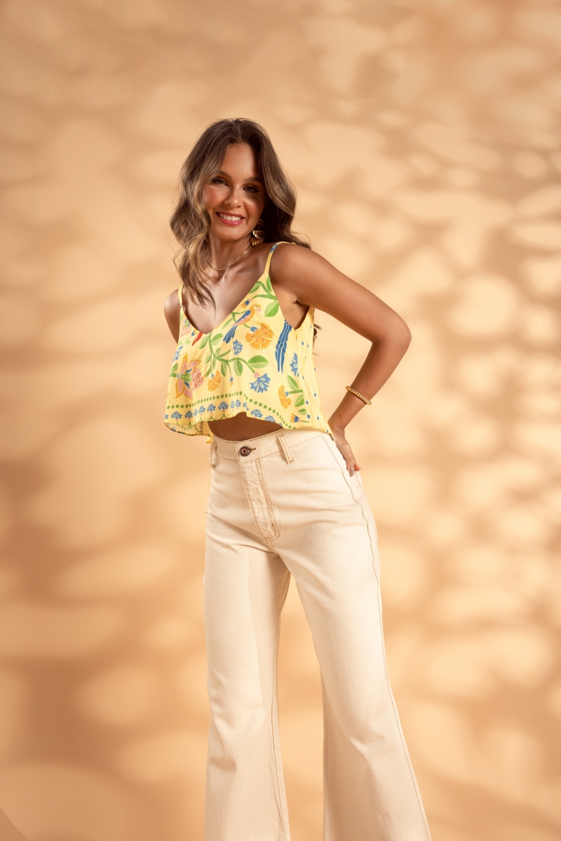 Cropped desenvolvido em tecido viscose com alças reguláveis e estampa exclusiva Fille.