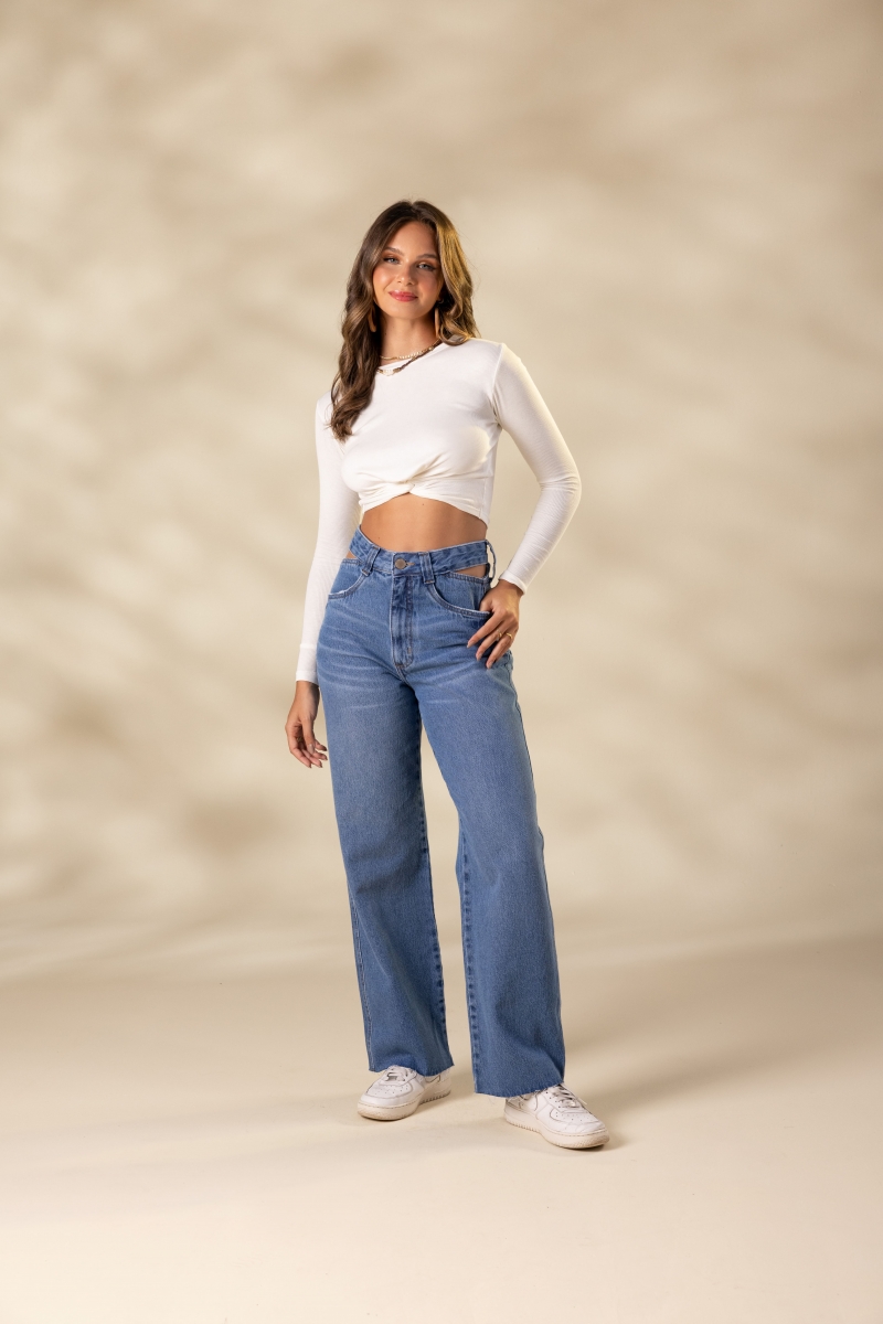 Calça desenvolvida em tecido jeans 100% algodão, com recortes vazados no cós lateral e lavagem diferenciada.