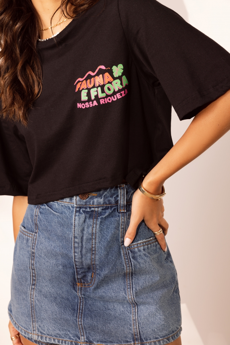 T-Cropped desenvolvida em tecido 100% algodão, com barra frente e costa assimétrica, e aplicação de silk na frente e costa inteira.
