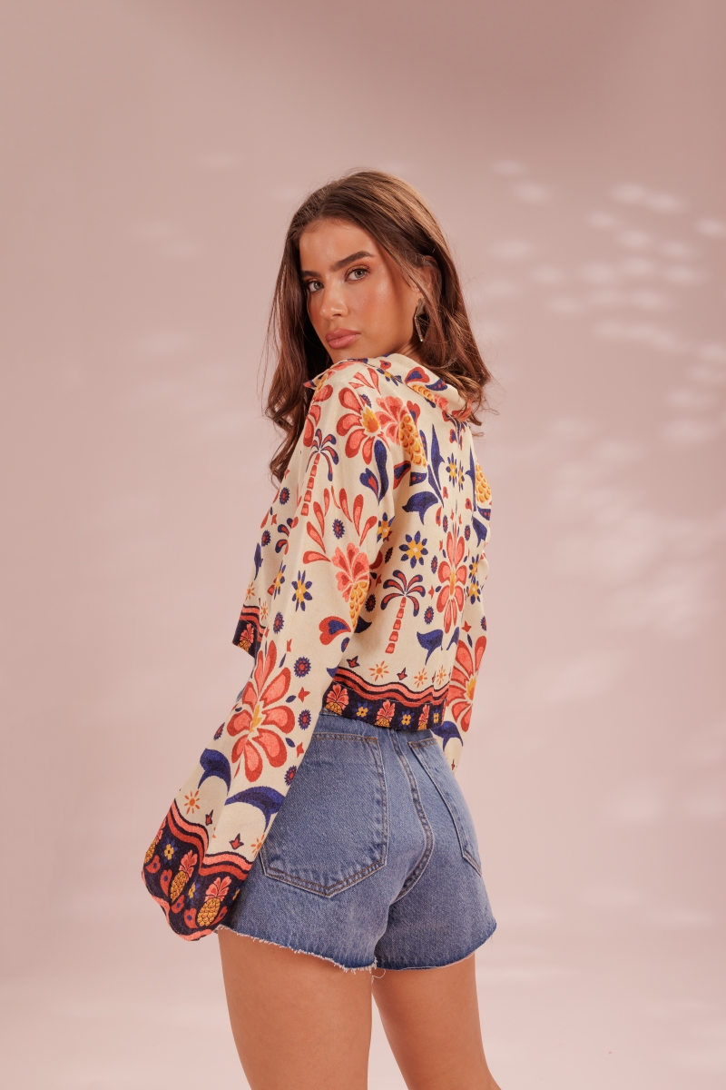 Blusa desenvolvida em tecido linho com estampa exclusiva Fille, rolotê de amarração frontal e acabamento com aviamento tassel.