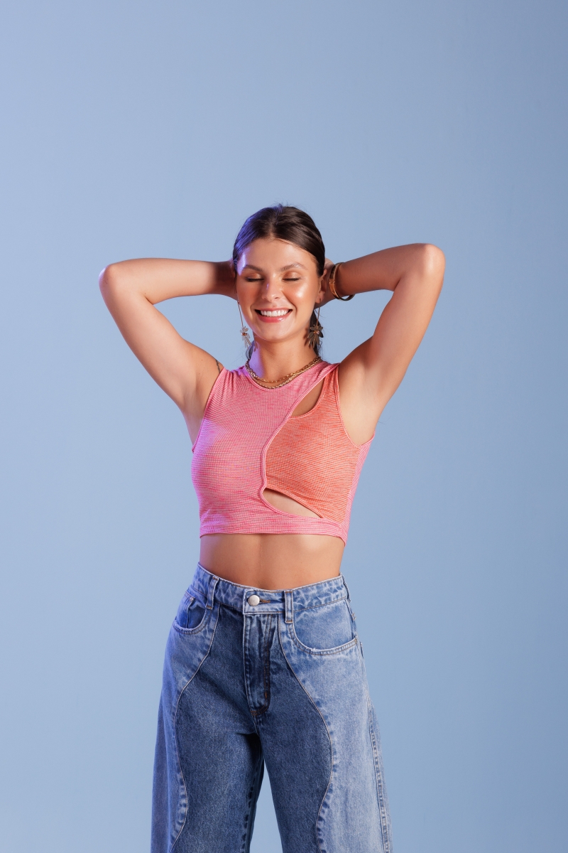 Cropped bicolor, desenvolvido em malha algodão, com recortes vazados na frente.