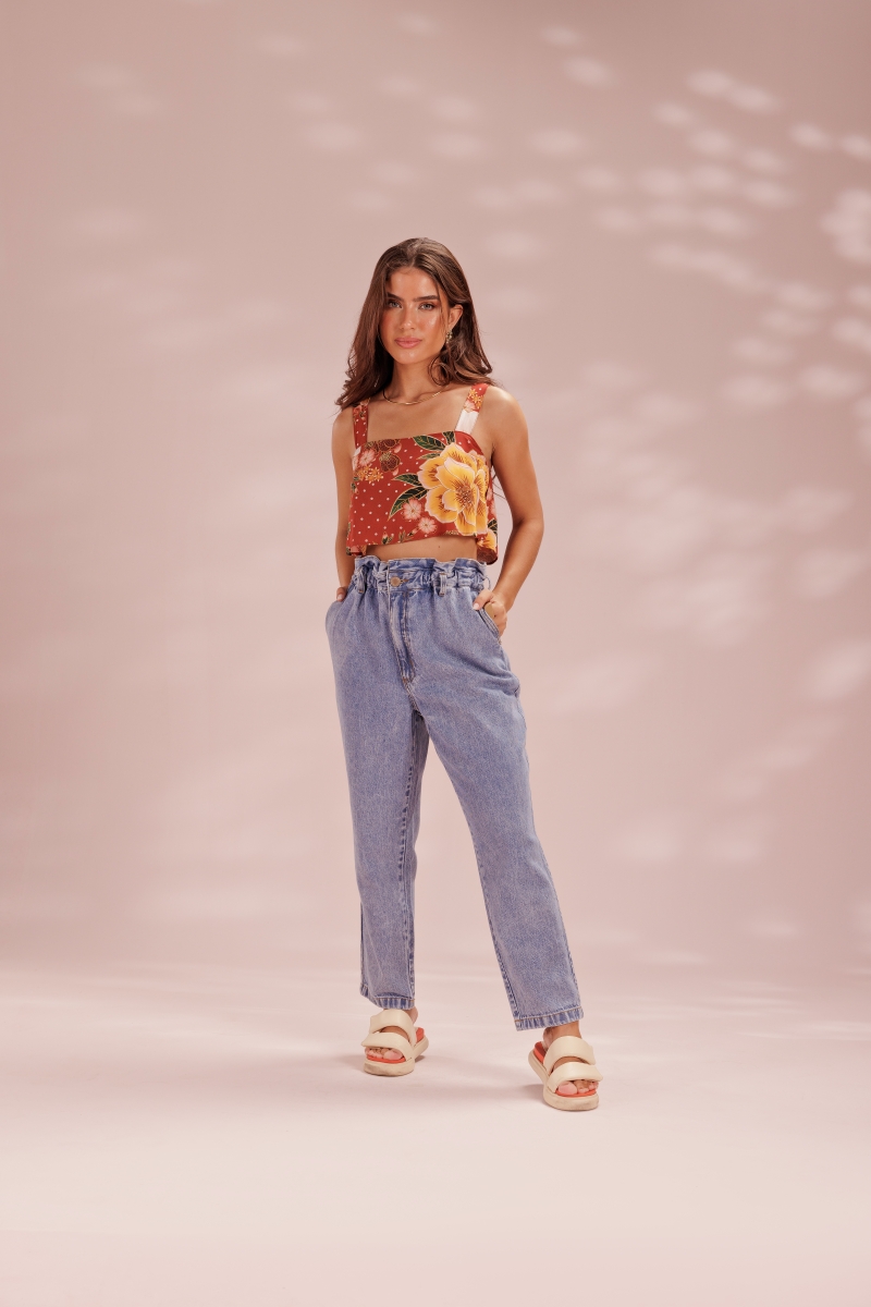 Cropped desenvolvido em tecido viscose, em estampa exclusiva Fille, com fendas laterais no babado.
