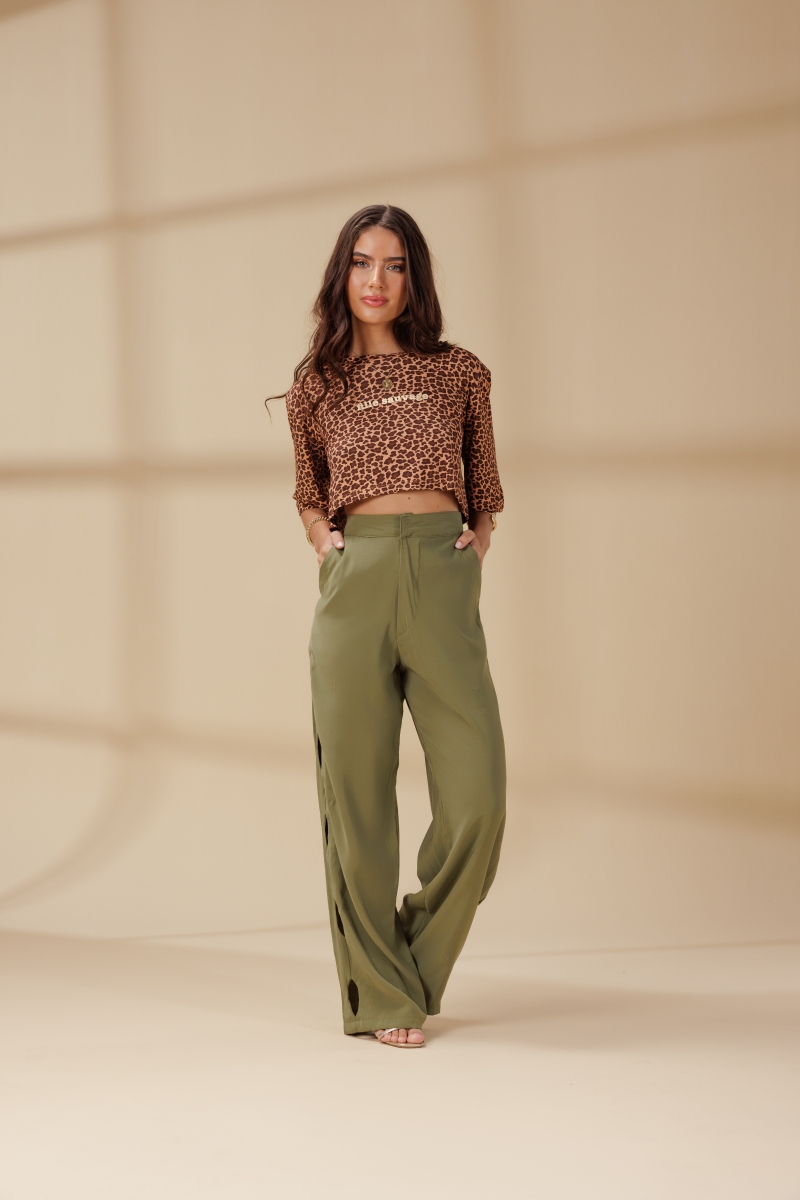 Calça alfaiataria desenvolvida em tecido viscose, modelagem cintura alta e vazados laterais.