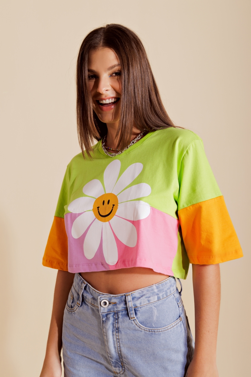 T-Cropped desenvolvida em tecido 100% algodão em 4 cores, modelagem ampla e aplicação de silk exclusiva.