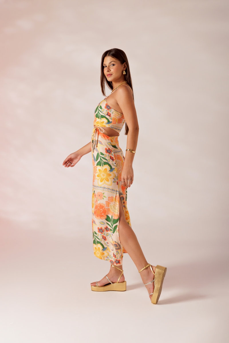 Vestido desenvolvido em tecido viscose com estampa exclusiva Fille, recorte vazado na cintura com rolotê de amarração, fenda lateral e alça ajustável.