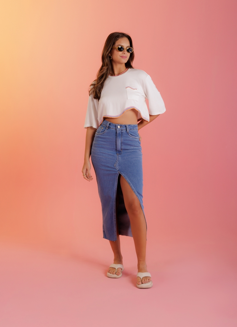 Saia midi desenvolvida em tecido jeans com elastano, modelagem cintura alta e fenda frontal.