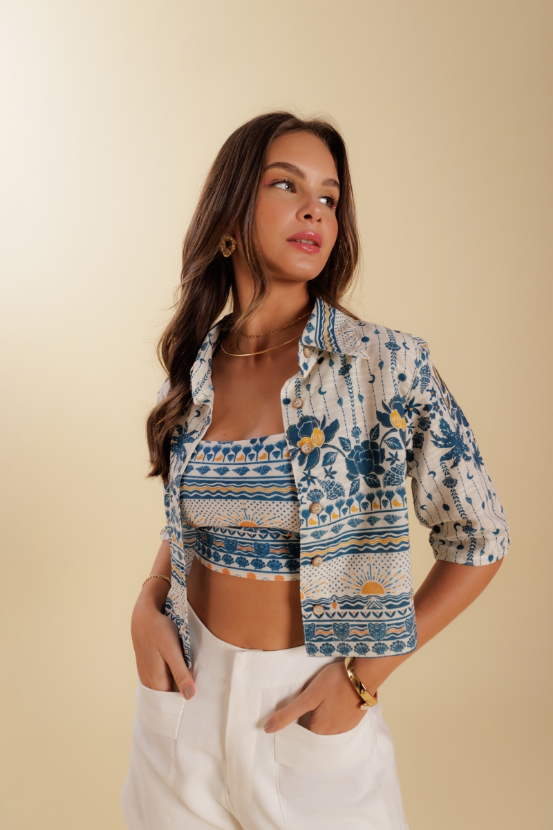 Camisa cropped desenvolvida em tecido viscose, com estampa exclusiva Fille, botões Fille.