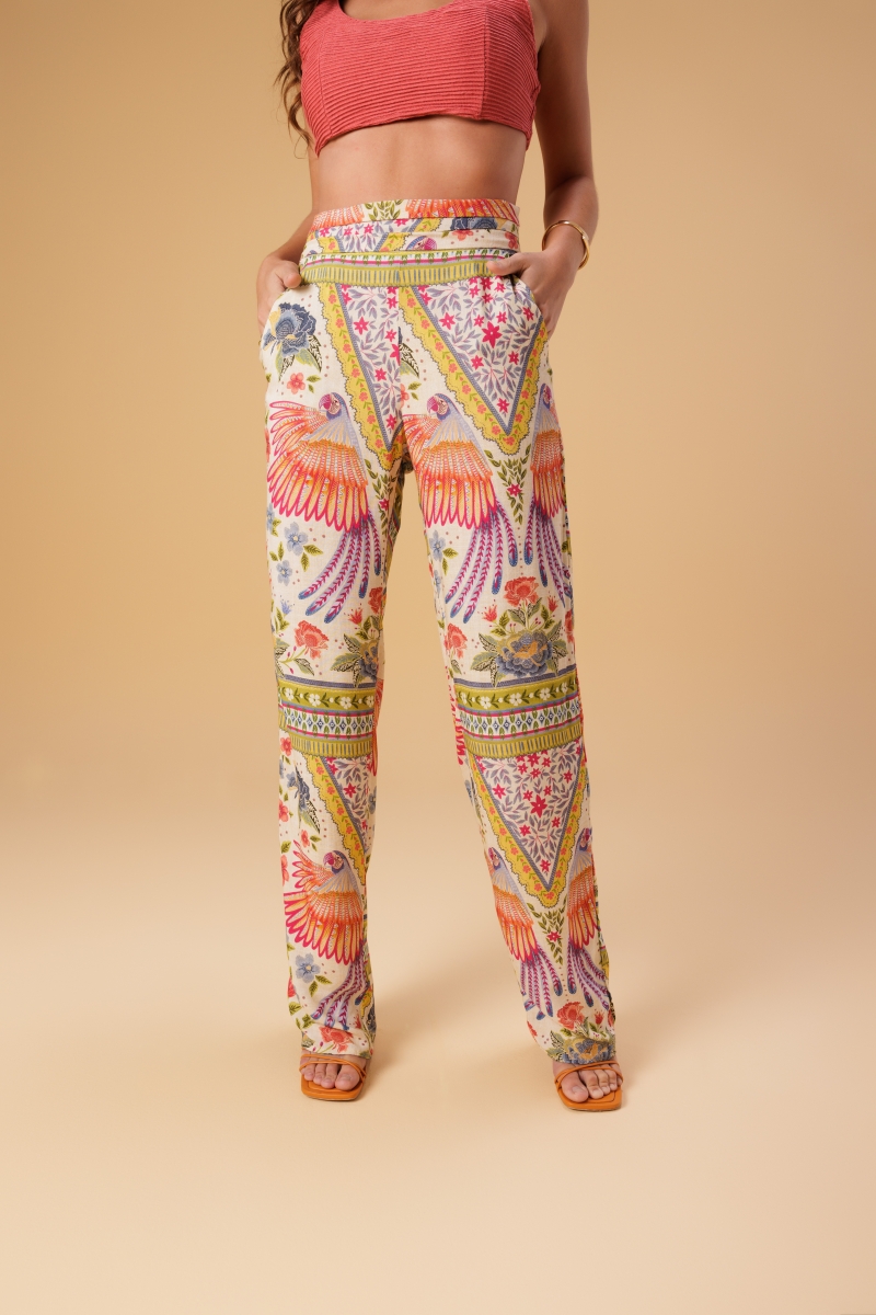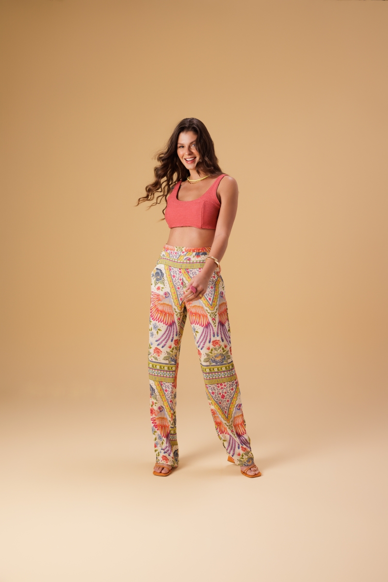 Calça desenvolvida em tecido viscose com estampa exclusiva Fille, modelagem cintura alta e cós com detalhes.