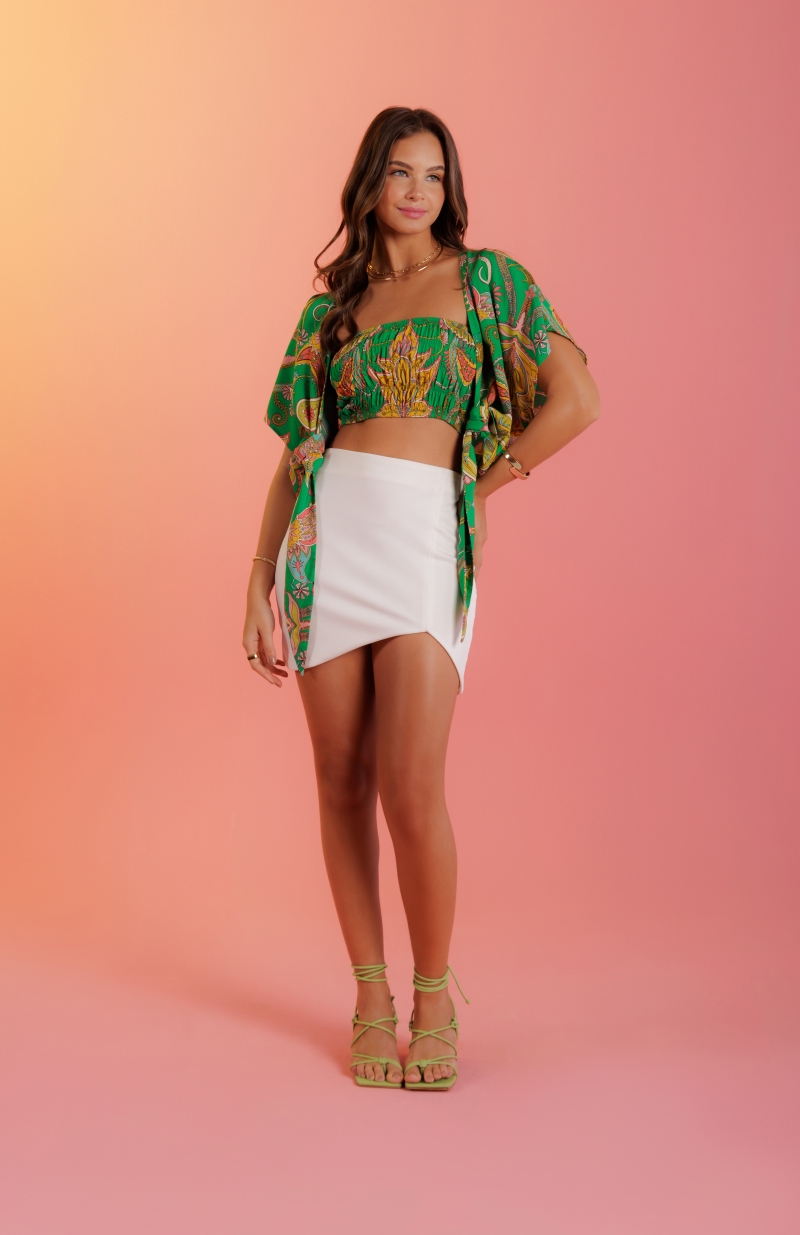 Saia desenvolvida em tecido de composição poliester com elastano, modelagem cintura alta, barra assimétrica frontal e aplicação de forro.