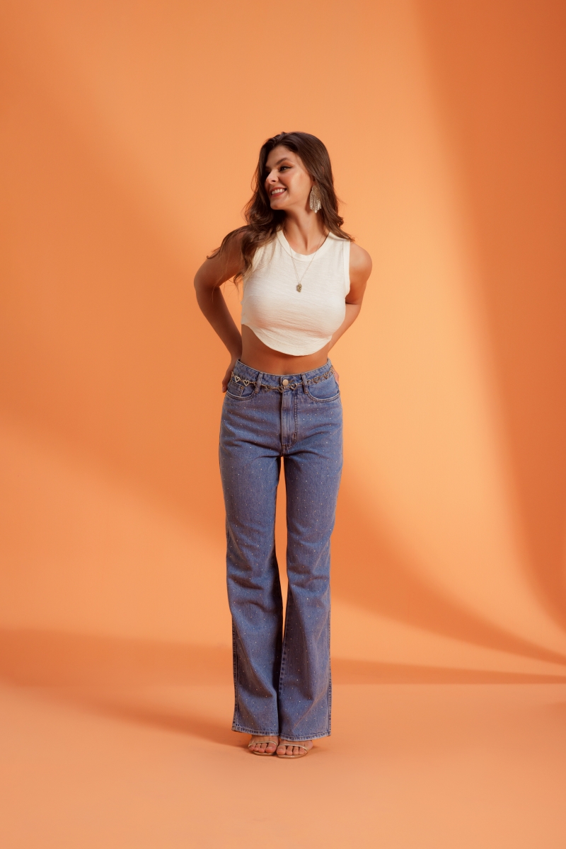 Cropped desenvolvido em tecido algodão com leve textura, com assimetria frontal na barra.