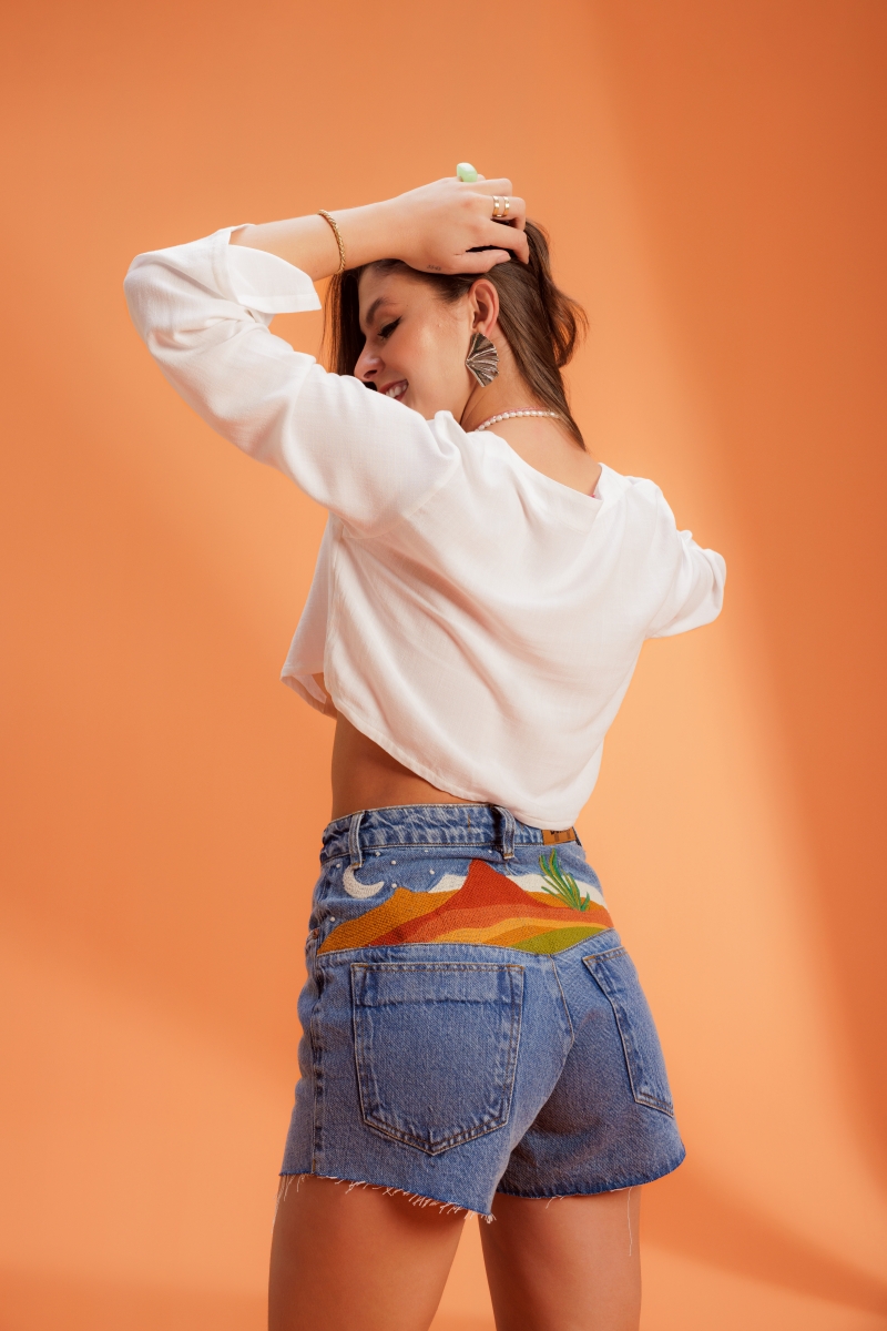Shorts desenvolvido em tecido jeans 100% algodão, com bordado na costa, exclusivo Fille