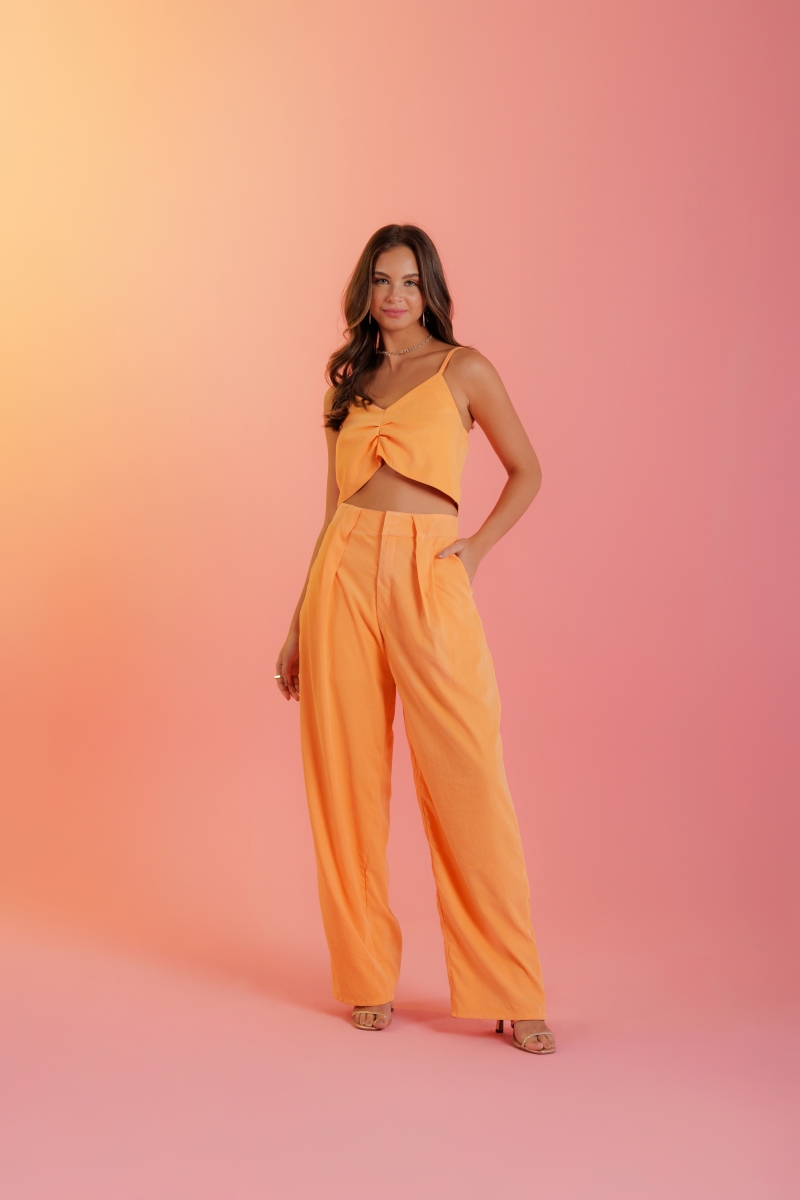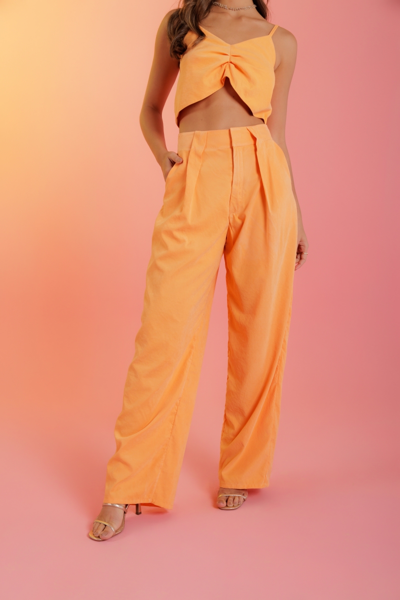 Calça desenvolvida em tecido com textura aveludada, com modelagem cintura alta e pregas frontais no cós.