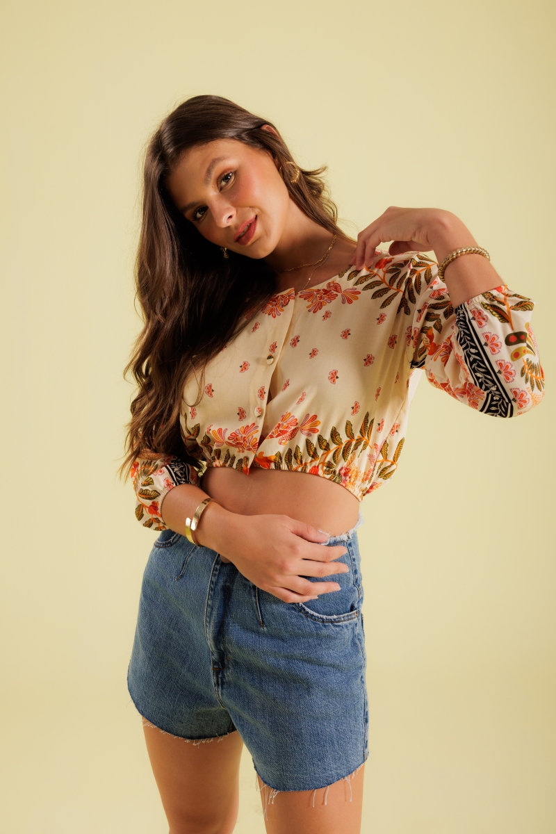 Blusa desenvolvida em tecido viscose, com elástico e botões frontais, com estampa exclusiva Fille.