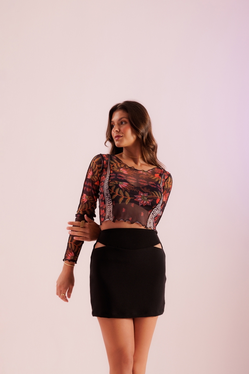 Cropped desenvolvido em tecido tule, mangas longas e com estampa exclusiva Fille.