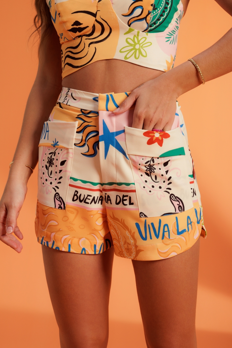 Shorts desenvolvido em tecido de composição poliester com elastano, estampa exclusiva Fille, bolsos frontais e barra assimétrica.
