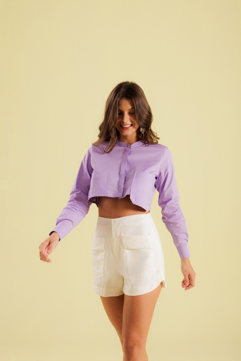 Camisa desenvolvida em tecido tricoline, com bolsos frontais assimétricos e argola com vazado na costa.