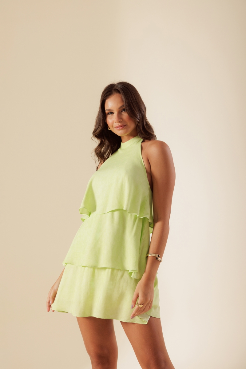 Vestido desenvolvido em tecido viscose, frente única e com babados em camadas.