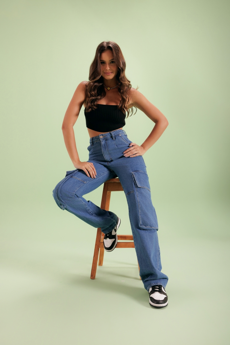 Calça desenvolvida em tecido jeans 100% algodão, com maxi bolsos cargo nas laterais.