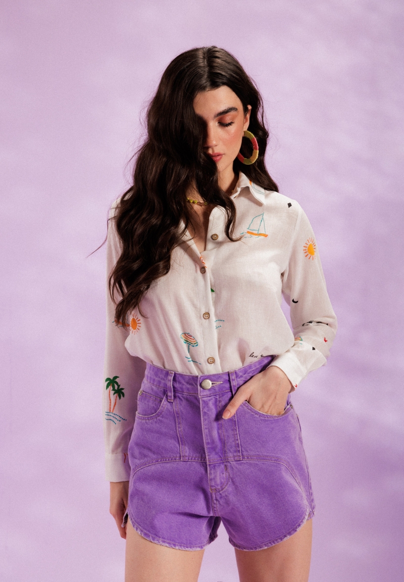 Shorts desenvolvido em tecido jeans 100% algodão, com recortes e barra assimétrica.