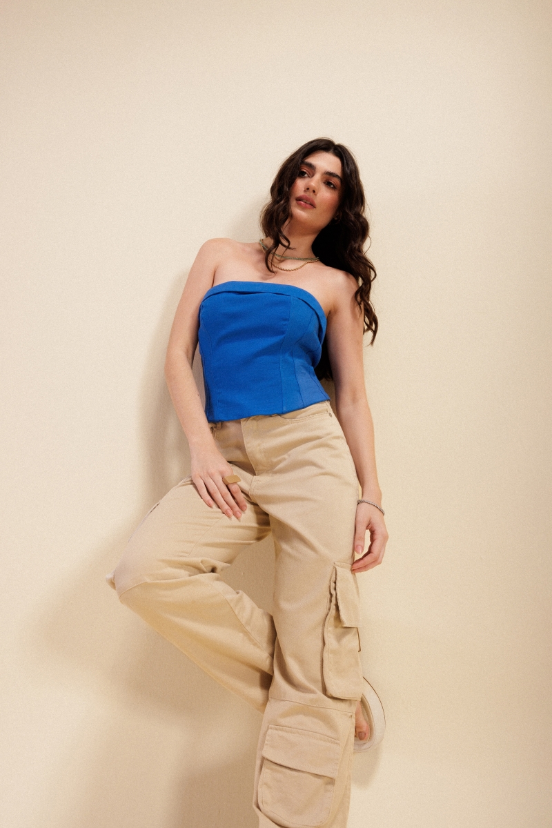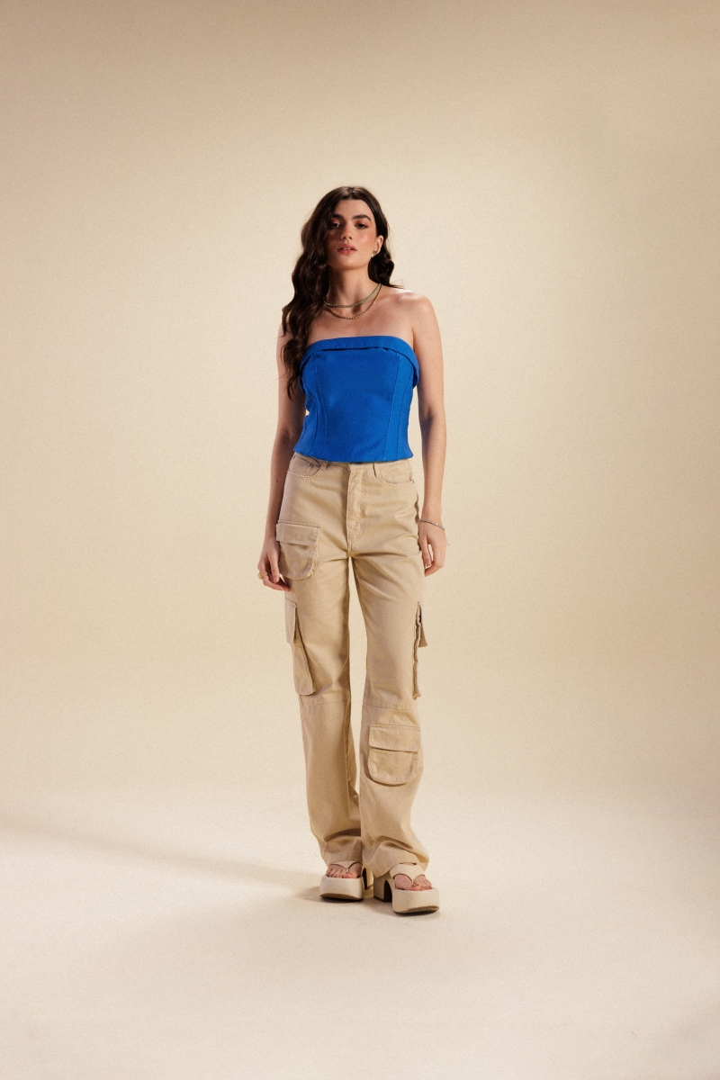 Corset desenvolvido em tecido alfaiataria, com zíper destacável na costa.