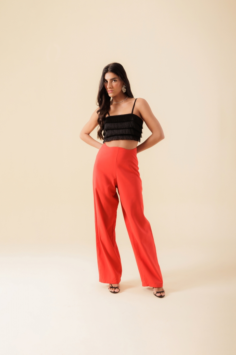 Cropped desenvolvido em tecido alfaiataria com elastano, e aplicação de franjas.
