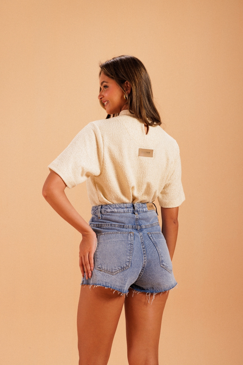 Blusa desenvolvida em malha jacquard com leve textura, gola levemente alta e pequenas fendas laterais.