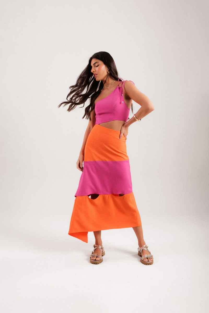Vestido bicolor desenvolvido em tecido viscose, um ombro só com amarração, vazado na cintura e recortes e vazados na saia.