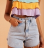 Shorts desenvolvido em tecido jeans 100% algodão, modelagem cintura alta, barra asa delta e ilhos nos bolsos costa.