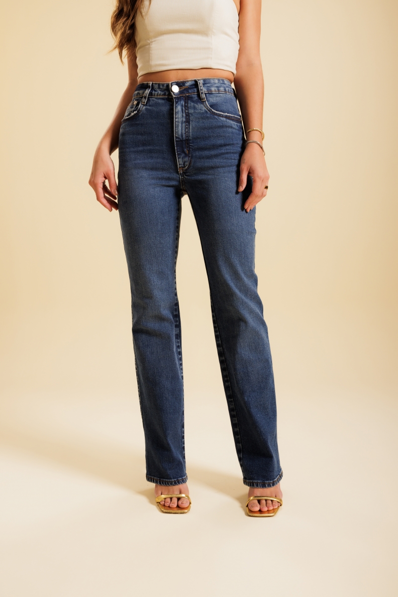 Calça desenvolvida em tecido jeans algodão com elastano, modelagem cintura alta.