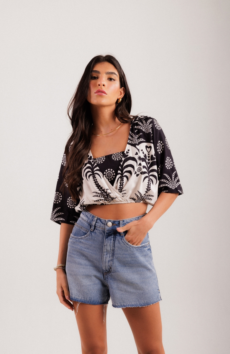 Cropped desenvolvido em tecido viscose com top e estampa exclusiva Fille.
